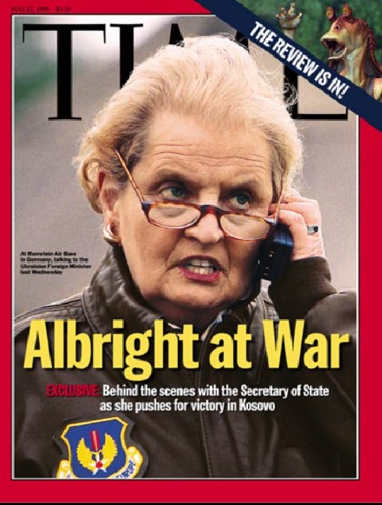 She supported and led the NATO bombing campaign in 1999 to halt ethnic cleansing in Kosovo. This campaign would become known as “Madeleine Albright’s War”. She also supported the NATO invasion of Afghanistan which happened under the Bush administration.