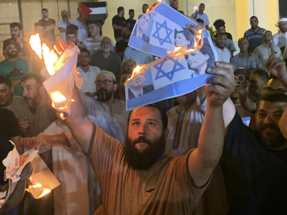People burn photos showing Israeli Foreign Minister Eli Cohen and his Libyan counterpart Najla Mangoush in Tripoli, Libya, Sunday, Aug. 27, 2023. Cohen and Mangoush met in the Italian capital, Rome, last week, according to the Israeli foreign ministry. [Picture: AP Photo/Yousef Murad]