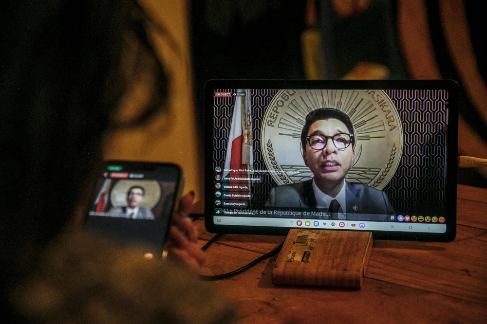 Image: Madagascan President Andry Rajoelina’s speaks to the nation via his official Facebook page on Monday.Rijasolo / AFP – Getty Images